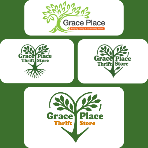 This mood board guided the vision for a heart-shaped tree logo that represents growth, renewal, and compassion. A key focus was clearly identifying Grace Place as a thrift store, helping address the common question of, “What is Grace Place?”